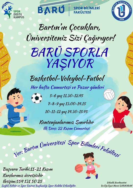 Bartın Üniversitesi (BARÜ), "Spor Dostu Kampüs" anlayışı doğrultusunda, Bartınlı çocuklar için ücretsiz spor kursları başlatıyor. "Bartın'ın Çocukları, Üniversiteniz Sizi Çağırıyor!" sloganıyla duyurulan proje kapsamında, 5-12 yaş arası çocuklar basketbol, voleybol ve futbol branşlarında eğitim alacak.