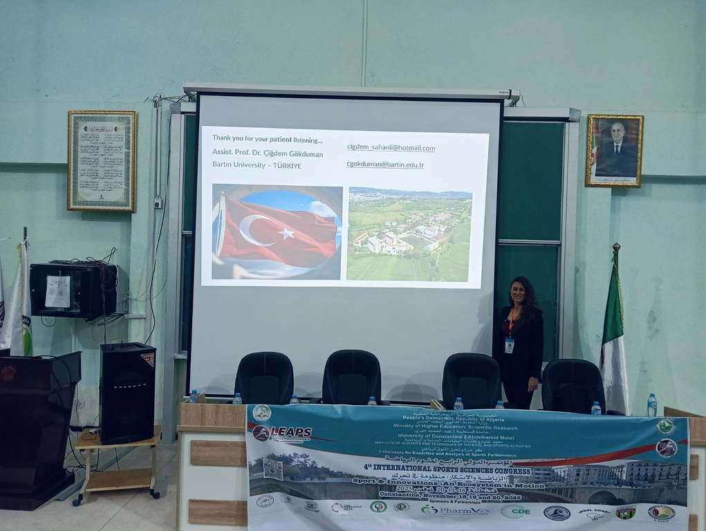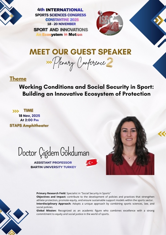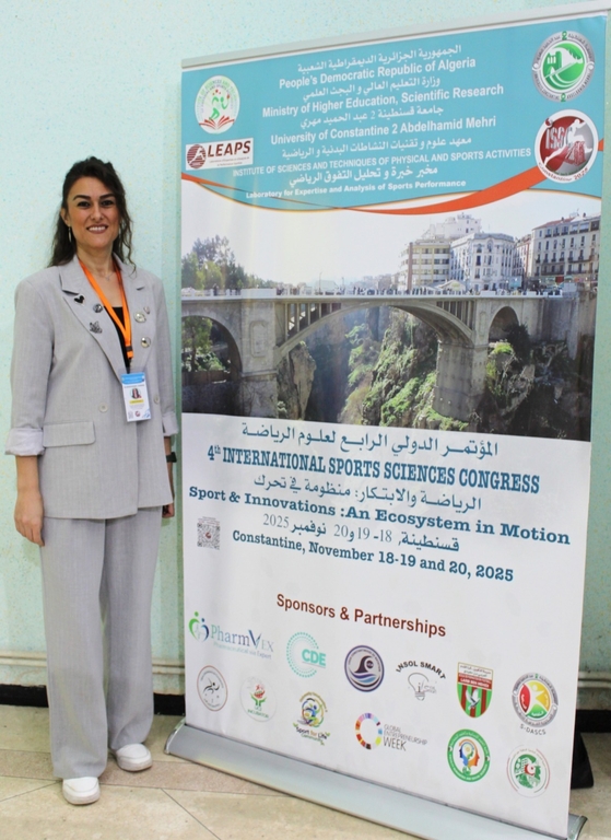 Fakültemiz Dr. Öğr. Üyesi Çiğdem Gökduman, 18–20 Kasım 2025 tarihlerinde Cezayir’in Constantine şehrinde düzenlenen 4. Uluslararası Spor Bilimleri Kongresi’nde sporcuların sosyal güvenlik algısı, korunma düzeyi ve çalışma koşullarına ilişkin “Working Conditions and Social Security in Sport: Building an Innovative Ecosystem of Protection” başlıklı açılış konuşmasını gerçekleştirdi.